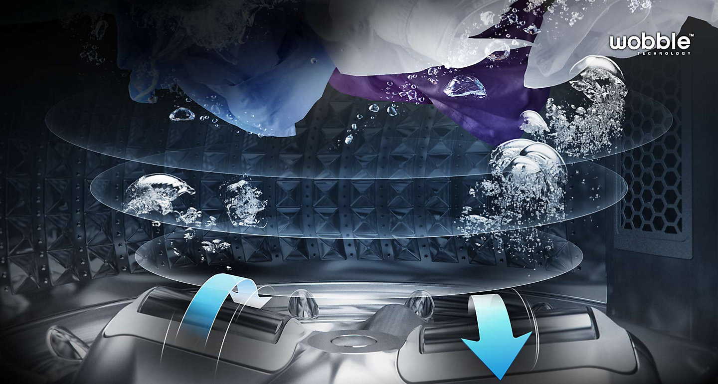 เทคโนโลยี Wobble ถนอมเนื้อผ้าอย่างอ่อนโยน โดยไม่บั่นทอนประสิทธิภาพในการซัก แกนซัก Wobble จะสร้างกระแสน้ำหลายทิศทาง เพื่อป้องกันการพันกันของผ้า และเพิ่มประสิทธิภาพในการซัก