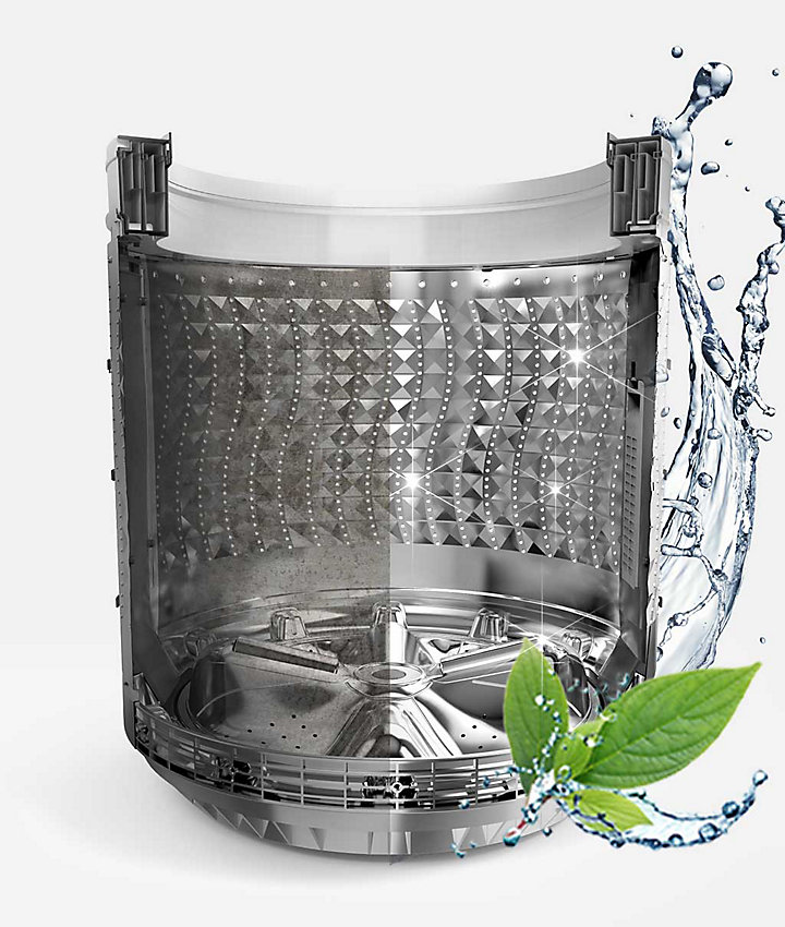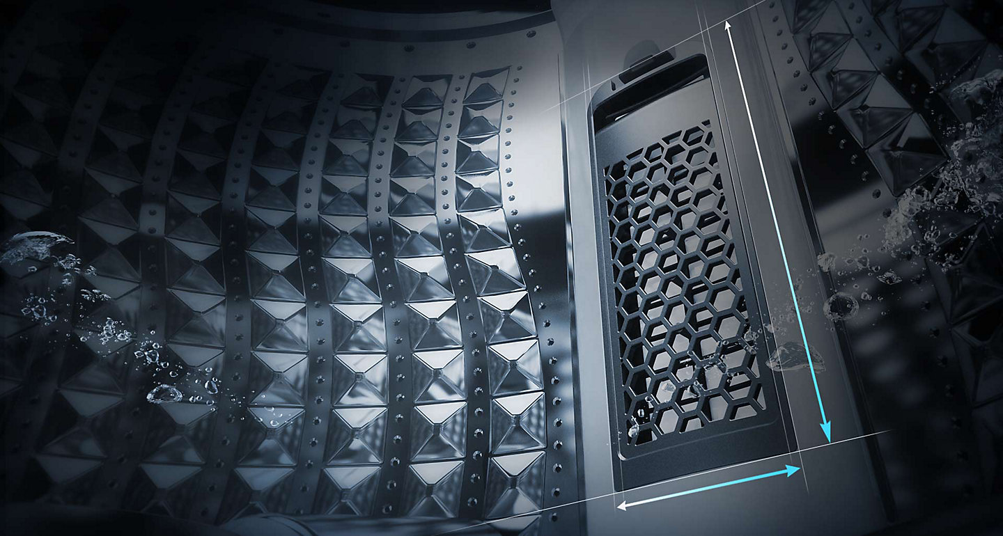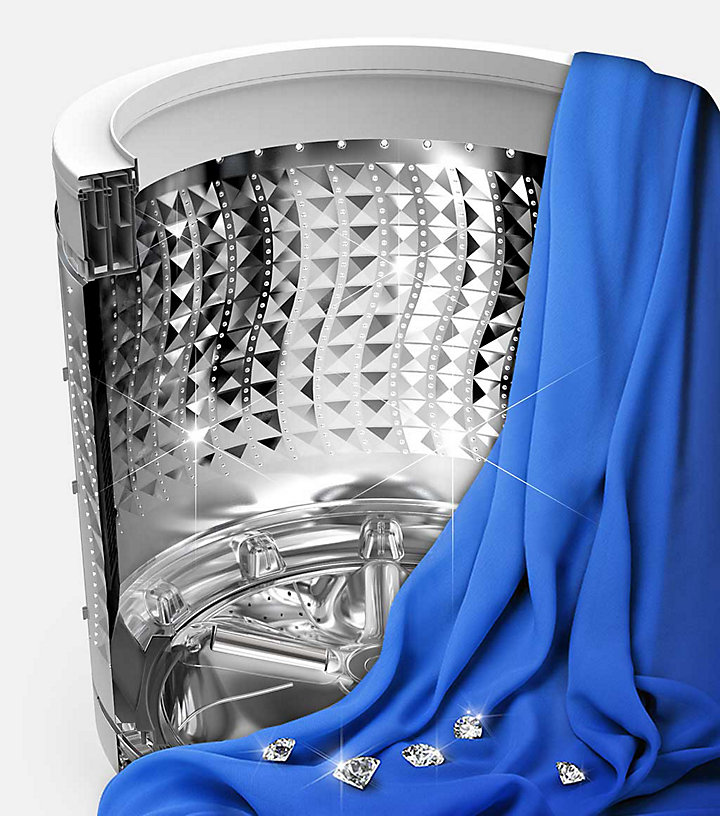 ถังซัก Diamond Drum มีดีไซน์ที่ “โค้งมนอย่างนุ่มนวล” พร้อมร่องรูปสี่เหลี่ยมข้าวหลามตัดที่ราบเรียบ จึงอ่อนโยนต่อเสื้อผ้าของคุณ รูระบายน้ำขนาดเล็กป้องกันผ้าไม่ให้เข้าไปติดจนเกิดความเสียหาย