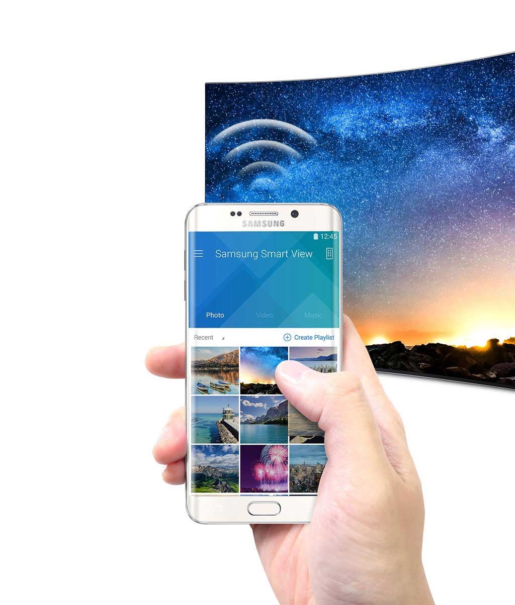 » แชร์คอนเทนต์ของคุณสู่จอทีวีได้อย่างง่ายดาย « ส่งภาพ วิดีโอ และเพลงจากโทรศัพท์มือถือและพีซีของคุณไปยังสมาร์ททีวี โดยใช้แอพ Samsung Smart View มอบการผสานรวมที่ยอดเยี่ยมและการเชื่อมต่อที่ง่ายดายกับอุปกรณ์ส่วนบุคคลส่วนใหญ่