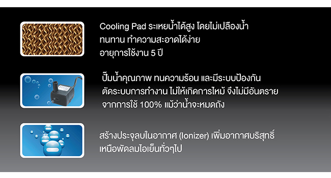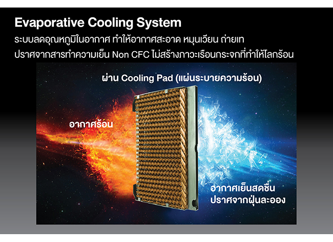- เย็นกว่าระบบทำความเย็นทั่วไป โดยใช้แผ่นทำความเย็นแบบรังผึ้งทั้ง 3 ด้าน